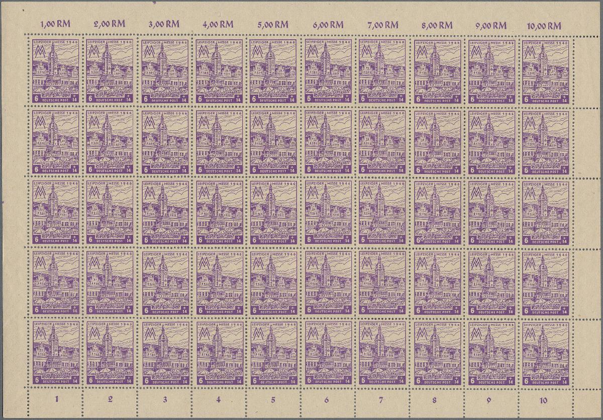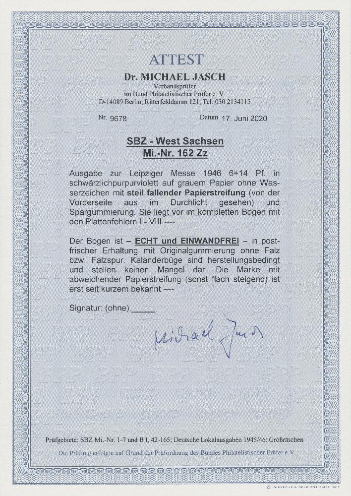 | Zusatzinformationen und Suchstichworte: | Christoph Gärtner 7. Sonderauktion IBRA Essen 26. Mai 2023 Los 3 D SBZ Westsachsen 1946 Leipziger Messe 6+14 Pf. schwärzlichpurpurviolett auf grauem Papier OHNE WASSERZEICHEN mit STEIL FALLENDER PAPIERSTREIFUNG und Spargummierung, im kompletten Bogen von 50 Marken mit den entsprechenden Plattenfehlern I-VIII, in tadellos postfrischer Erhaltung (mit herstellungsbedingten, normalen Kalanderbügen). Diese Variante der Papierstreifung ist erst seit kurzem bekannt und im Michel bislang unbewertet. Zuschlag 1.500,00 EUR |