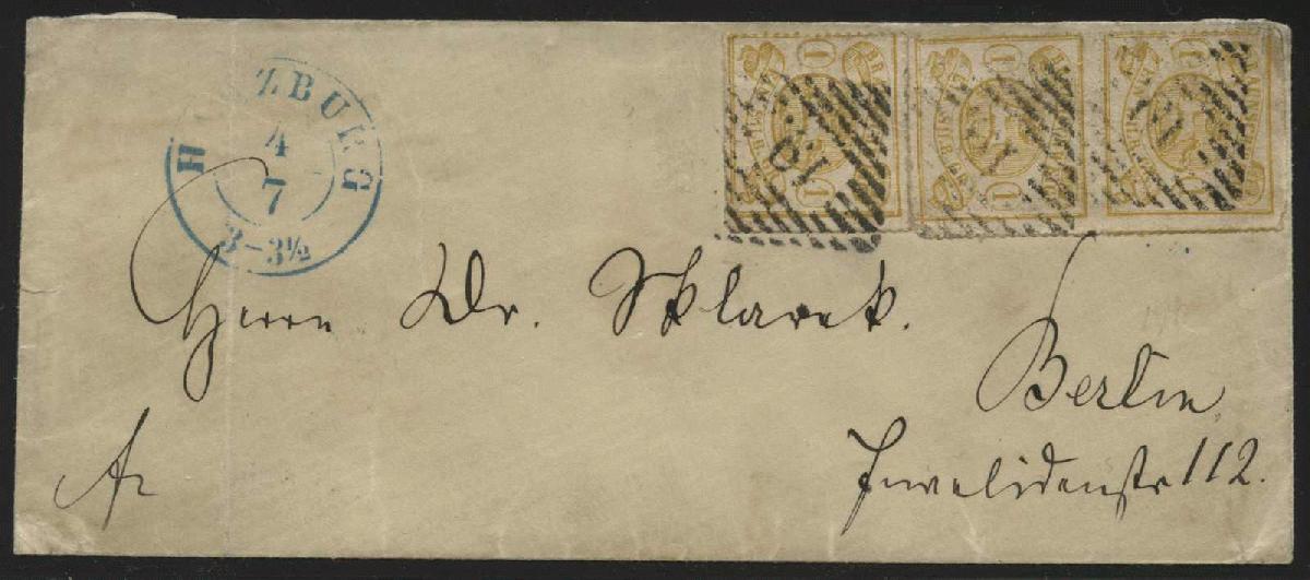 | Zusatzinformationen und Suchstichworte: | Tiergarten 11. Briefmarken und Münzen Auktion 22. Mai 2023 Los 33 Altdeutschland Braunschweig 1 Sgr. gelb, bogenförmig durchstochen 16, senkrechtes Paar und Einzelmarke auf portogerechtem Brief von Harzburg nach Berlin. Die Einzelmarke ist einwandfrei, die untere Marke des Paares tadellos, die obere Marke linke und rechte obere Ecke etwas beschädigt, kein weiterer Mangel. Ausruf 200,00 EUR |