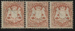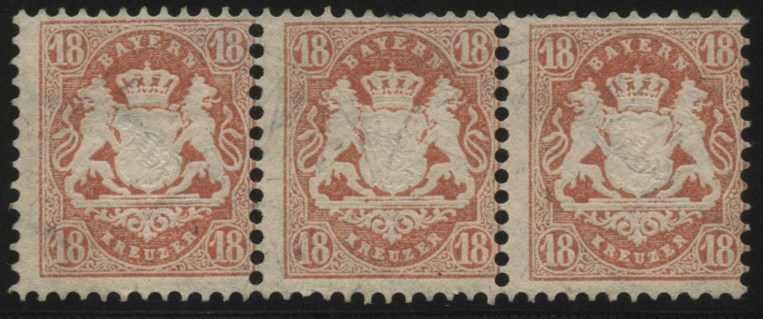 | Zusatzinformationen und Suchstichworte: | Tiergarten 11. Briefmarken und Münzen Auktion 22. Mai 2023 Los 15 Altdeutschland Bayern 18 Kr. dunkelziegelrot, WZ enge Rauten, waagerechter Dreierstreifen mit blauvioletten Einkreisern entwertet. Die erste Marke ist tadellos erhalten, die 2. und 3. haben oben leichte Zahnfehlerchen. Zähnung gering vorgetrennt, keine sonstigen Beanstandungen, nicht repariert. Dreierstreifen des hohen Kreuzerwertes sind selten, das vorliegende Exemplar ist frisch und farbtief erhalten Ausruf 400,00 EUR |