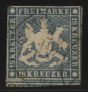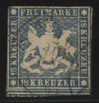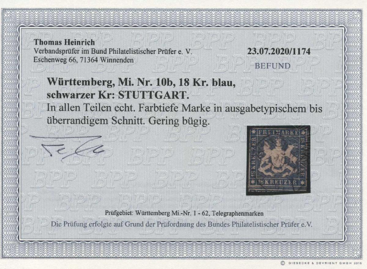 | Zusatzinformationen und Suchstichworte: | Tiergarten 11. Briefmarken und Münzen Auktion 22. Mai 2023 Los 124 Altdeutschland Württemberg 1857, 18 Kr. blau, farbtiefe Marke in ausgabetypischem bis überrandigem Schnitt, gering bügig, schwarzer "Stuttgart" Ausruf 150,00 EUR |