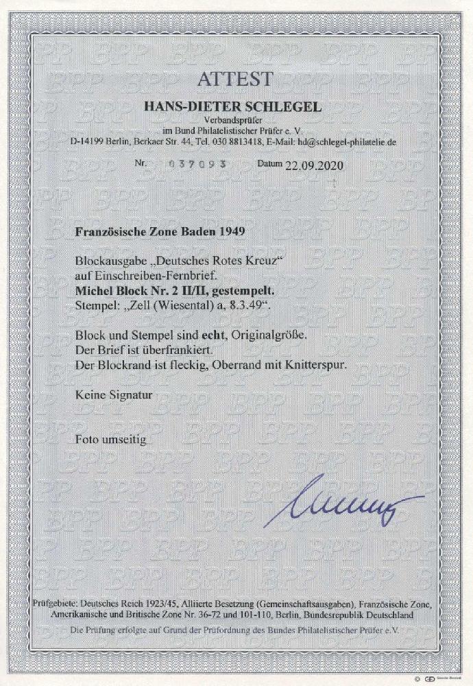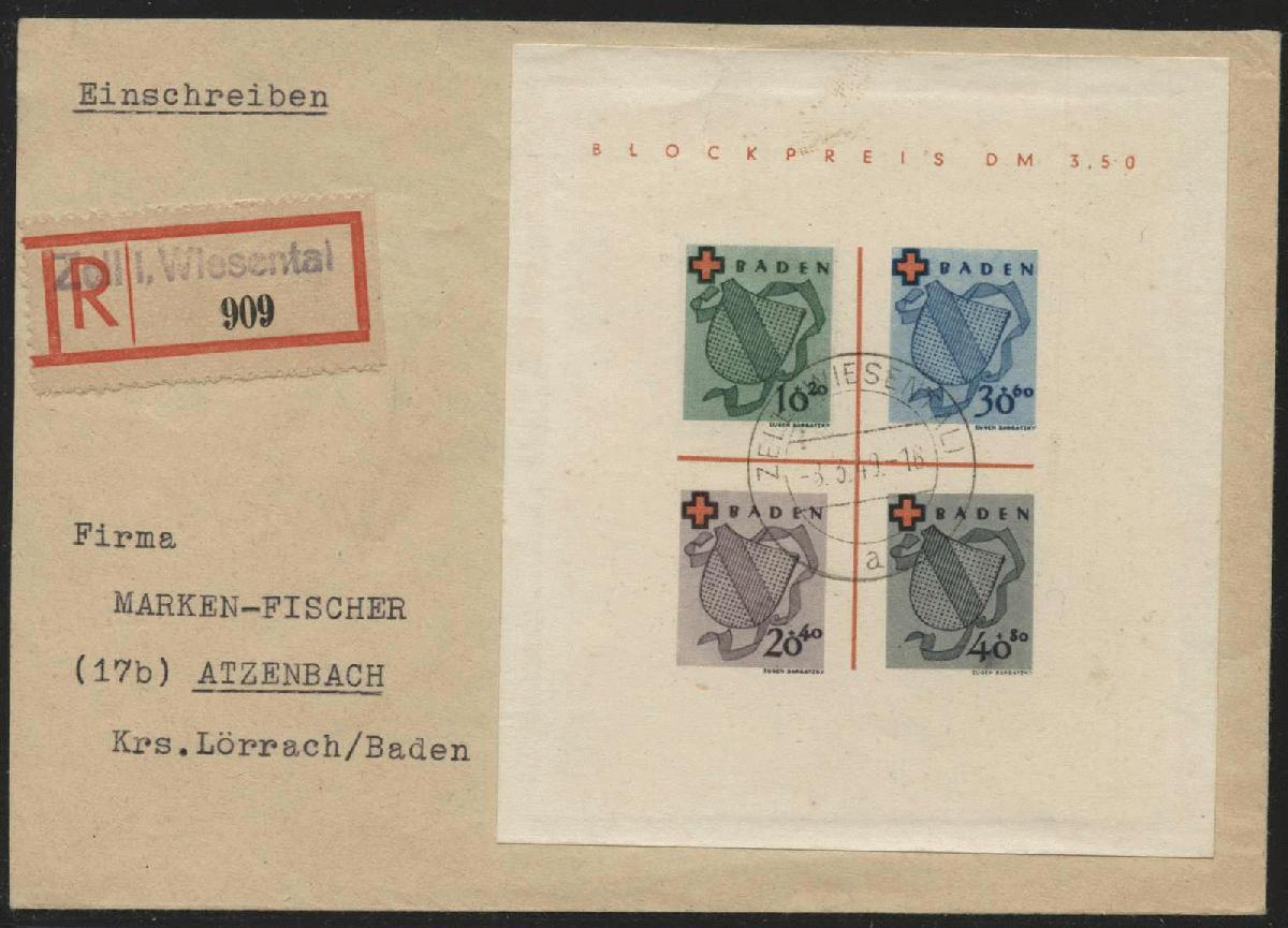 | Zusatzinformationen und Suchstichworte: | Tiergarten 11. Briefmarken und Münzen Auktion 22. Mai 2023 Los 551 Französische Zone Baden 1949, Rotes Kreuz - Block auf überfrankiertem R-Brief von Wiesental, Blockrand kleine Flecken und oben Knitterspur Ausruf 250,00 EUR |