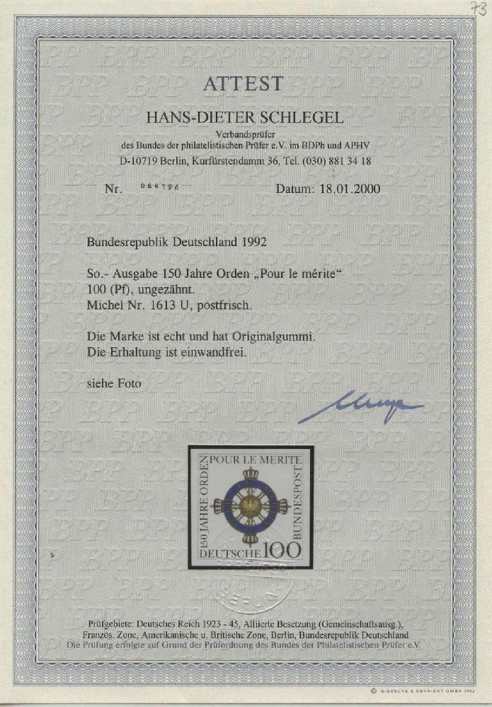 | Zusatzinformationen und Suchstichworte: | Tiergarten 11. Briefmarken und Münzen Auktion 22. Mai 2023 Los 670 Bundesrepublik Deutschland 1992, Pour le Merite ungezähntes Kabinettstück Zuschlag 40,00 EUR |