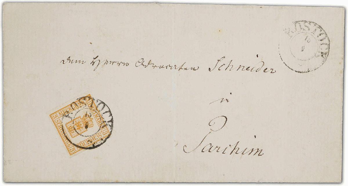 | Zusatzinformationen und Suchstichworte: | 32. Schlegel Auktionshaus Auktion 15. - 19. Mai 2023 Los 8 Altdeutschland Mecklenburg Schwerin 1856, 3 S. Wappen gelblichorange als Einzelfrankatur auf Brief nach Parchim, ein wunderbar farbfrisches und breitrandiges Exemplar, entwertet in Rostock, tadellos Zuschlag 130,00 EUR |