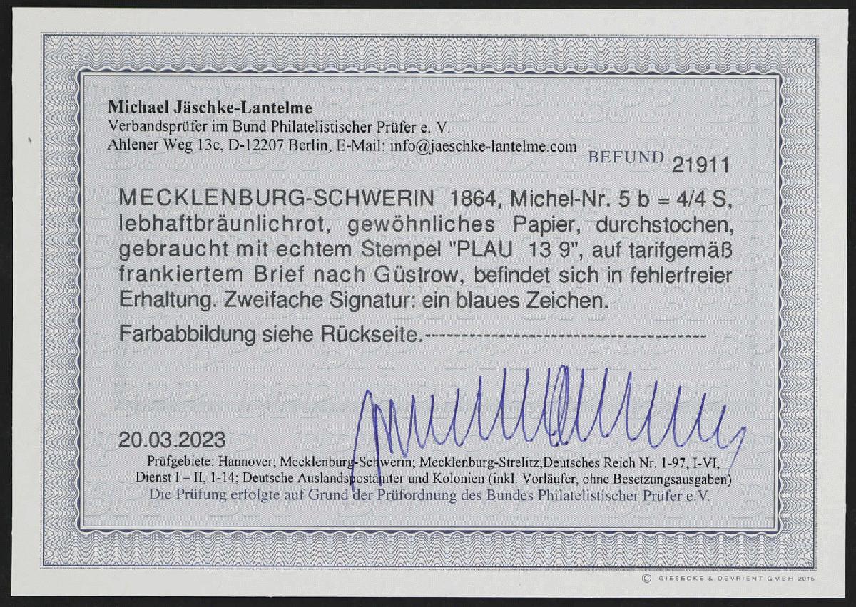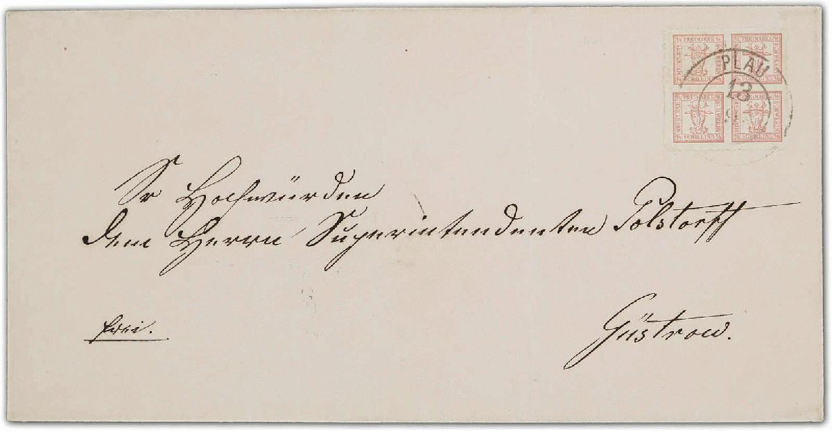 | Zusatzinformationen und Suchstichworte: | 32. Schlegel Auktionshaus Auktion 15. - 19. Mai 2023 Los 9 Altdeutschland Mecklenburg Schwerin 1864, 4/4 S. lebhaftbräunlichrot durchstochen auf optisch sehr reizvollem portorichtigen Brief nach Güstrow, sauber gestempelt in "PLAU" Zuschlag 170,00 EUR |
