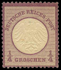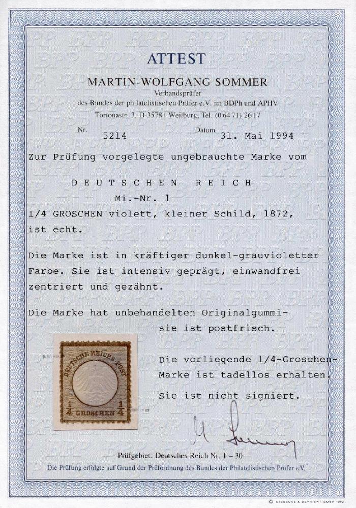 | Zusatzinformationen und Suchstichworte: | 32. Schlegel Auktionshaus Auktion 15. - 19. Mai 2023 Los 5267 Deutsches Reich, 1872 Kleiner Brustschild 1872, ¼ Gr. kleiner Schild violett, postfrisch mit intensiver Prägung, einwandfreie Qualität Zuschlag 1.000,00 EUR |