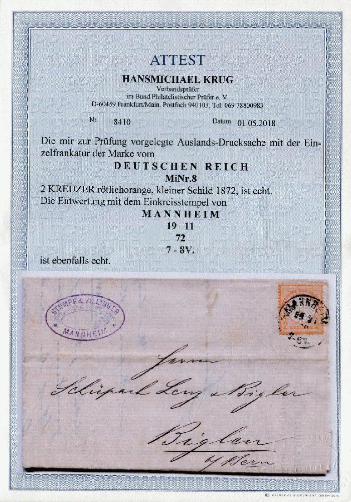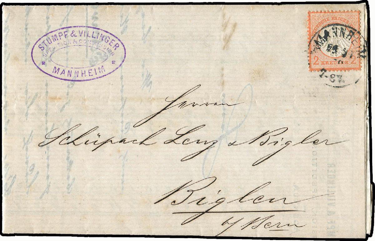 | Zusatzinformationen und Suchstichworte: | 32. Schlegel Auktionshaus Auktion 15. - 19. Mai 2023 Los 5273 Deutsches Reich, 1872 Kleiner Brustschild 1872, 2 Kr. kleiner Schild rötlichorange, farbfrisch, sehr gut geprägt, portogerecht als Einzelfrankatur auf Drucksache in die Schweiz, bis auf einen geschürften Zahn üblich gezähnt und in einwandfreier Qualität Ausruf 240,00 EUR |