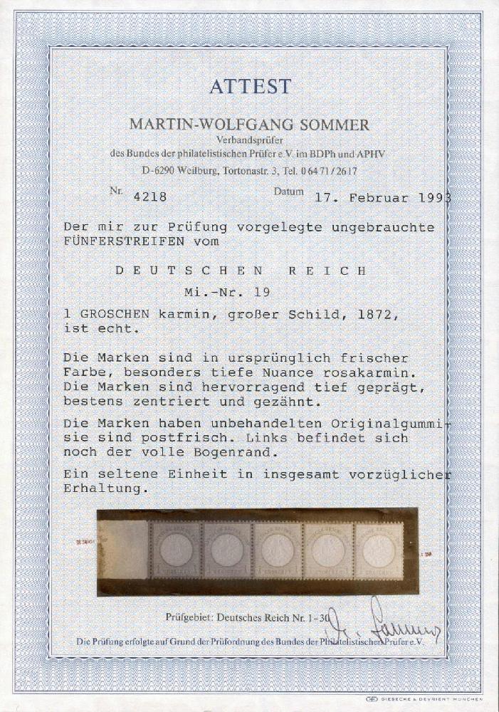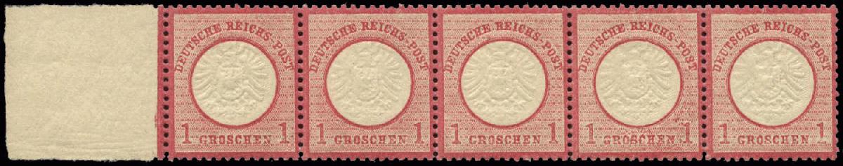 | Zusatzinformationen und Suchstichworte: | 32. Schlegel Auktionshaus Auktion 15. - 19. Mai 2023 Los 5288 Deutsches Reich, 1872 Grosser Brustschild 1872, 1 Gr. großer Schild karmin, waagerechter postfrischer Fünferstreifen vom linken Bogenrand, hervorragend zentriert, unsigniert und einwandfrei, die rechte Marke mit Variante "rechte Wertziffer gebrochen" (ME ca. 1.650,-) Ausruf 650,00 EUR |