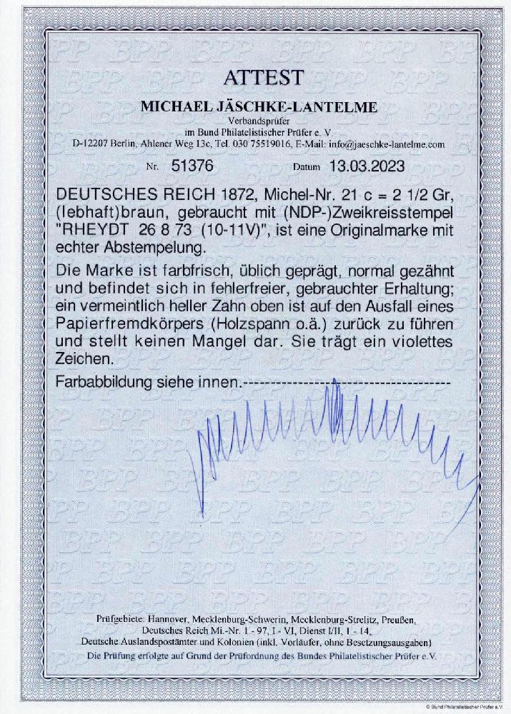 | Prüfgebiet: | Deutsches Reich 1871 - 1918 (Mi-Nr. 1 - 106) |