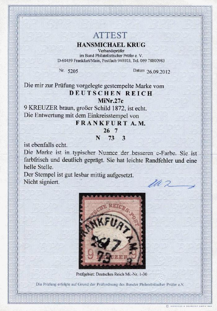 | Zusatzinformationen und Suchstichworte: | 32. Schlegel Auktionshaus Auktion 15. - 19. Mai 2023 Los 5304 Deutsches Reich, 1872 Grosser Brustschild 1872, 9 Kr. in der seltenen Farbe braun, sauber gestempelt und lediglich leichte Randfehler und eine helle Stelle Ausruf 180,00 EUR |