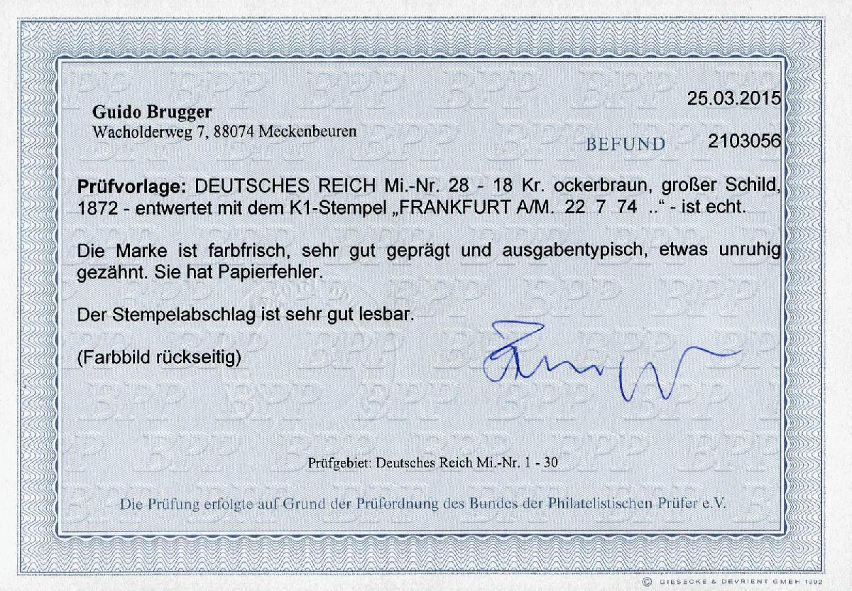 | Zusatzinformationen und Suchstichworte: | 32. Schlegel Auktionshaus Auktion 15. - 19. Mai 2023 Los 5305 Deutsches Reich, 1872 Grosser Brustschild 1872, 18 Kr. großer Schild ockerbraun, gestempelt, sehr gut geprägt, ausgabetypisch gezähnt, Papierfehler Zuschlag 460,00 EUR |