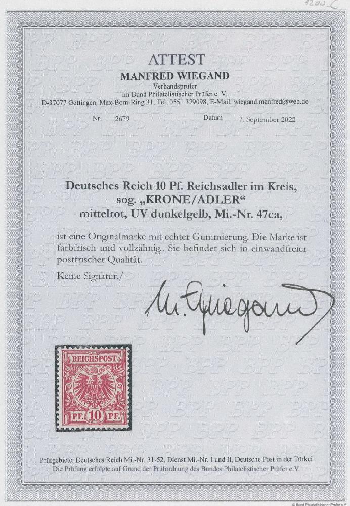 | Zusatzinformationen und Suchstichworte: | 32. Schlegel Auktionshaus Auktion 15. - 19. Mai 2023 Los 5323 Deutsches Reich, 1889 Krone/Adler 1889, 10 Pfg. Krone/Adler in der seltenen Farbe Mittelrot dunkelgelb quarzend, postfrisch, unsigniert Ausruf 400,00 EUR |