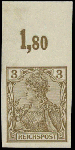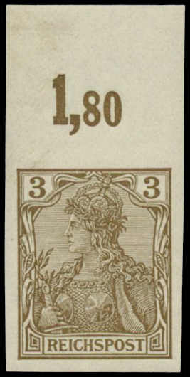 | Zusatzinformationen und Suchstichworte: | 32. Schlegel Auktionshaus Auktion 15. - 19. Mai 2023 Los 5337 Deutsches Reich, Germania Reichspost 1900, 3 Pfg. Germania Reichspost dunkelockerbraun, ungezähnt, postfrisches Exemplar vom Oberrand, unsigniert und auch im Rand völlig postfrisch, einwandfrei und farbfrisch Ausruf 750,00 EUR |