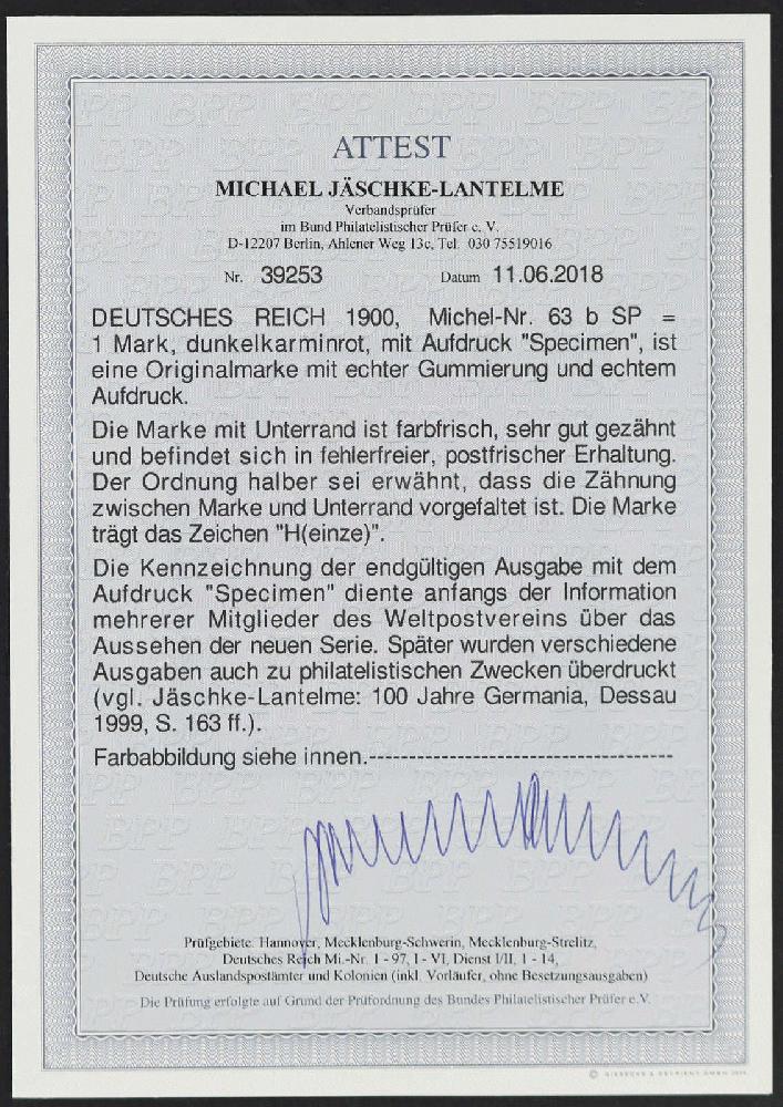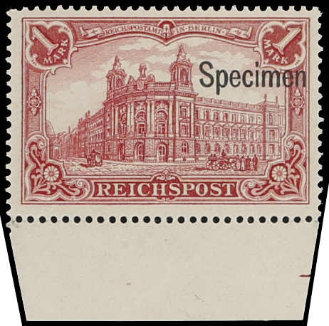| Zusatzinformationen und Suchstichworte: | 32. Schlegel Auktionshaus Auktion 15. - 19. Mai 2023 Los 5340 Deutsches Reich, Germania Reichspost 900, 1 M. Reichspostamt dunkelkarminrot, mit Aufdruck "Specimen", postfrisches Exemplar vom Unterrand (vorgefaltet), farbfrisch in einwandfreier Qualität, die Kennzeichnung der edngültigen Ausgabe mit dem Aufdruck "Specimen" dienst anfangs der Information mehrerer Mitglieder des Weltpostvereins über das Aussehen der neuen Serie, später wurden verschiedene Ausgaben auch zu philatelistischen Zwecken überdruckt Ausruf 300,00 EUR |