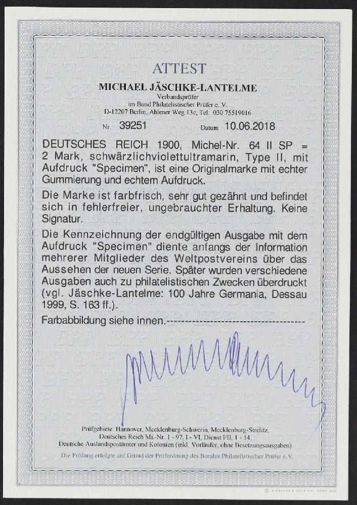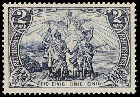 | Zusatzinformationen und Suchstichworte: | 32. Schlegel Auktionshaus Auktion 15. - 19. Mai 2023 Los 5345 Deutsches Reich, Germania Reichspost 1900, 2 M. Nord und Süd schwärzlichviolettultramarin, Type II, mit Aufdruck "Specimen", ungebraucht, farbfrisch, einwandfrei, die Kennzeichnung der endgültigen Ausgabe mit dem Aufdruck "Specimen" diente anfangs der Information mehrerer Mitglieder des Weltpostvereins über das Aussehen der neuen Serie, später wurden verschiedene Ausgaben auch zu philatelistischen Zwecken überdruckt Ausruf 500,00 EUR |