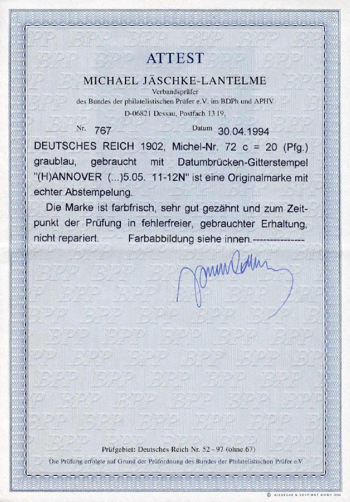 | Prüfgebiet: | Deutsches Reich 1871 - 1918 (Mi-Nr. 1 - 106) |