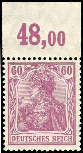 | Zusatzinformationen und Suchstichworte: | 32. Schlegel Auktionshaus Auktion 15. - 19. Mai 2023 Los 5412 Deutsches Reich, Germania mit WZ 1911, 60 Pfg. Germania dunkelrötlichlila, Friedensdruck, postfrisches Exemplar vom Plattendruck-Oberrand ohne Strichelleiste, farbfrisch und schneeweiß, ungefaltet in einwandfreier Qualität Ausruf 580,00 EUR |