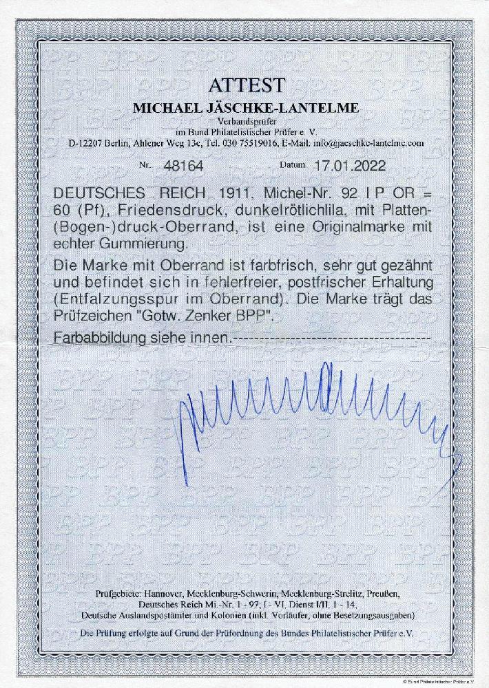 | Prüfer: | Jäschke-Lantelme, Michael (BPP (Bund Philatelistischer Prüfer)) |