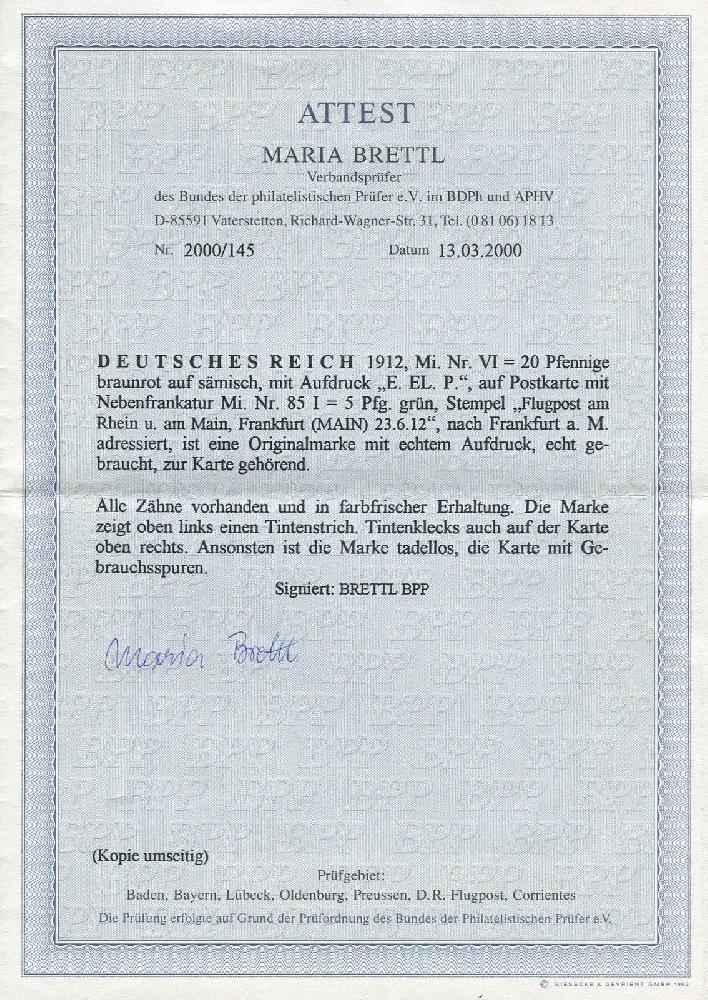 | Prüfer: | Brettl, Maria (BPP (Bund Philatelistischer Prüfer)) |