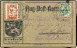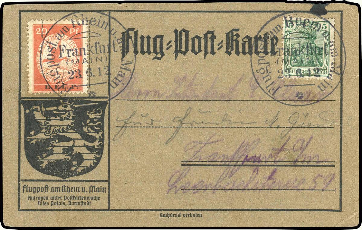 | Zusatzinformationen und Suchstichworte: | 32. Schlegel Auktionshaus Auktion 15. - 19. Mai 2023 Los 5438 Deutsches Reich 1912, 20 Pfg. E.EL.P. orange auf hellgraugelb mit 5 Pfg. Germania auf Flug-Post-Karte, entwertet "Flugpost am Rhein u. am Main * Frankfurt (MAIN) 23.6.12", farbfrisch und vollzähnig, Marke oben links Tintenstrich, Tintenklecks auch auf der Karte oben rechts, leichte Beförderungsspuren Ausruf 400,00 EUR |