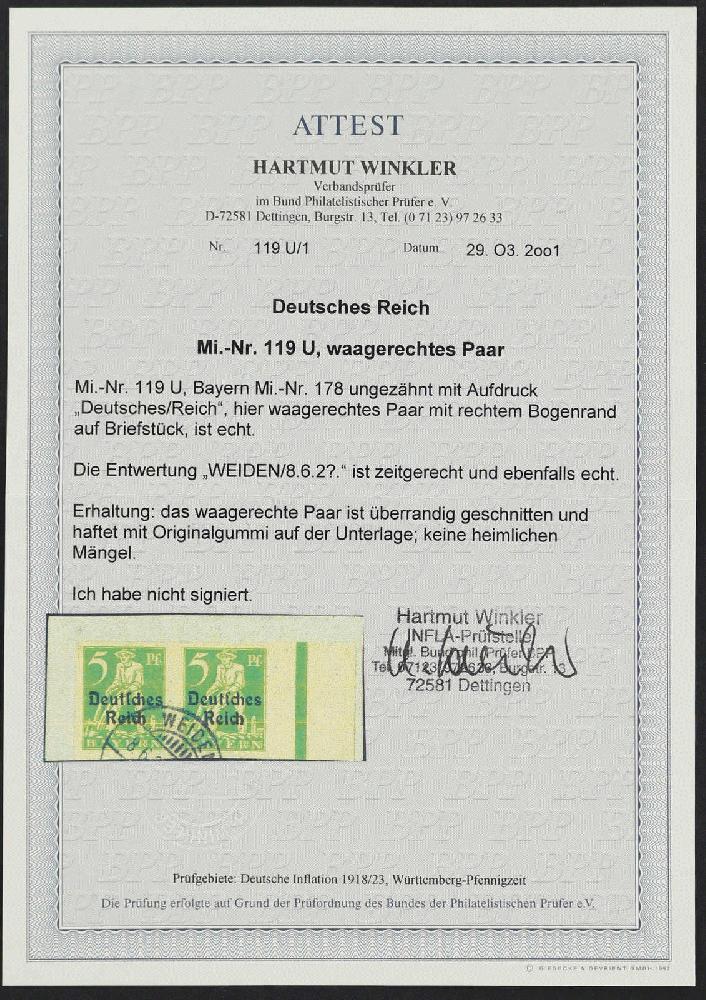 | Zusatzinformationen und Suchstichworte: | 32. Schlegel Auktionshaus Auktion 15. - 19. Mai 2023 Los 5456 Deutsches Reich, 1919-1920 1920, 5 Pfg. Bayern-Abschied (dunkel)gelbgrün, ungezähnt im breitrandigen waagerechten Paar vom rechten Bogenrand auf Briefstrück mit glasklarer Entwertung, einwandfreie Qualität Zuschlag 380,00 EUR |