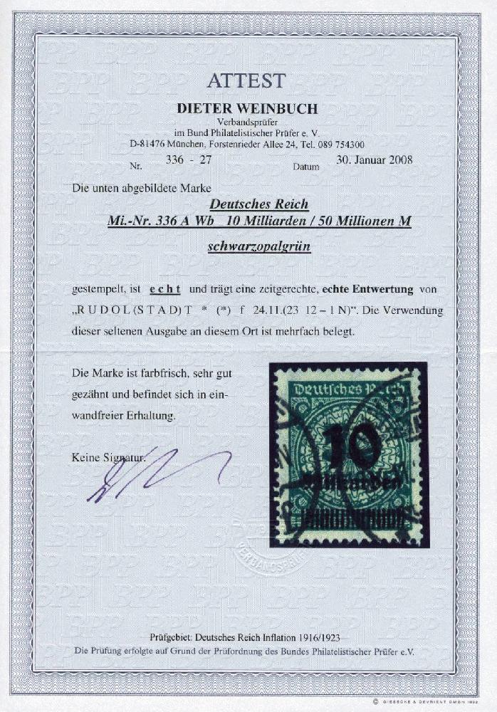 | Prüfgebiet: | Deutsches Reich 1919 - 1923 (Mi-Nr. 107 - 343) |