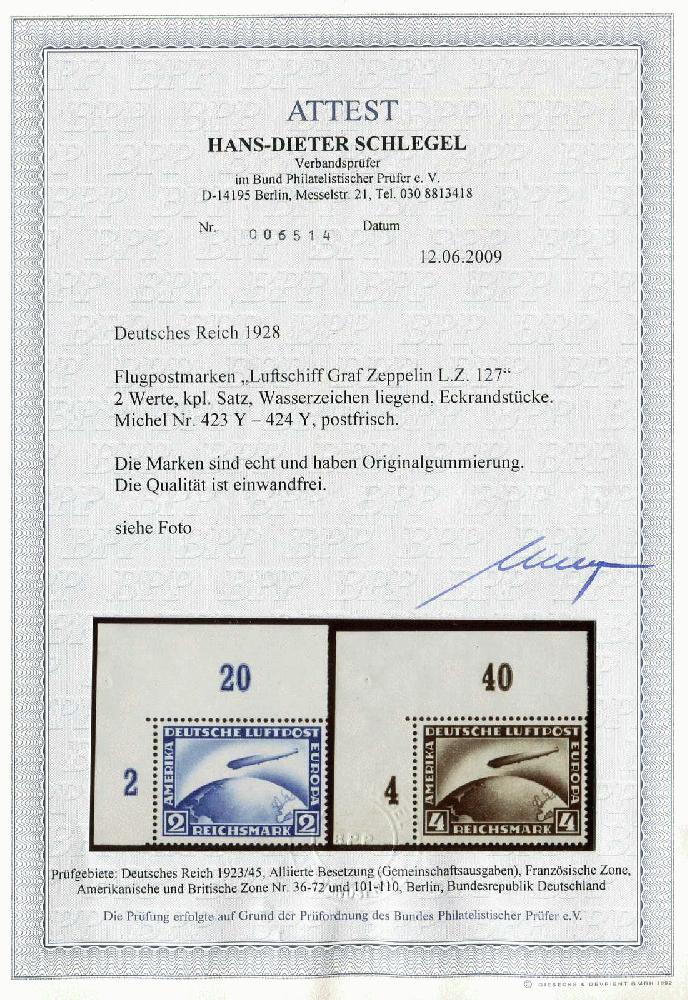 | Zusatzinformationen und Suchstichworte: | 32. Schlegel Auktionshaus Auktion 15. - 19. Mai 2023 Los 5616 Deutsches Reich, 1923/32 Weimarer Republik 1929, 2 und 4 M. Zeppelin, kompletter postfrischer Satz einheitlich aus der oberen linken Bogenecke, schneeweiß und ungefaltet, einwandfreie Qualität Zuschlag 290,00 EUR |