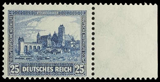 | Zusatzinformationen und Suchstichworte: | 32. Schlegel Auktionshaus Auktion 15. - 19. Mai 2023 Los 5660 Deutsches Reich, 1923/32 Weimarer Republik 1930, 25+10 Pfg. Schloss und Dom Marienwerder blau, postfrisches Exemplar vom rechten Bogenrand, ungefaltet und unsigniert in einwandfreier Qualität, auch im Rand völlig postfrisch Zuschlag 190,00 EUR |
