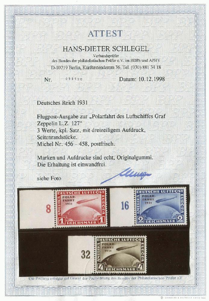 | Zusatzinformationen und Suchstichworte: | 32. Schlegel Auktionshaus Auktion 15. - 19. Mai 2023 Los 5664 Deutsches Reich, 1923/32 Weimarer Republik 1931, 1-4 M. Polarfahrt, kompletter postfrischer Satz einheitlich vom linken Bogenrand, schneeweiß und einwandfrei, ungefaltet und unsigniert Ausruf 2.100,00 EUR |
