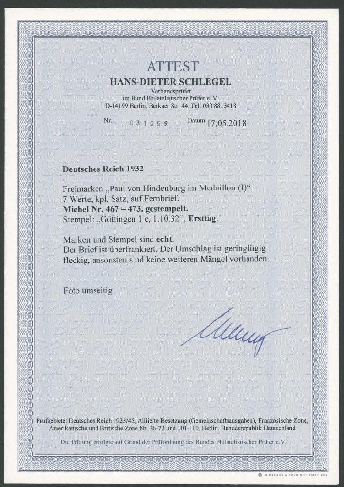 | Zusatzinformationen und Suchstichworte: | 32. Schlegel Auktionshaus Auktion 15. - 19. Mai 2023 Los 5675 Deutsches Reich, 1923/32 Weimarer Republik 1932, 4-50 Pfg. Heuss Medaillon, komplette Ausgabe auf Satz-Fernbrief mit Ersttagsentwertung "GÖTTINGEN * 1 e 1.10.32", Umschlag geringfügig fleckig, Marken einwandfrei Zuschlag 250,00 EUR |