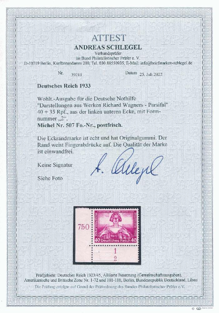 | Zusatzinformationen und Suchstichworte: | 32. Schlegel Auktionshaus Auktion 15. - 19. Mai 2023 Los 5723 Deutsches Reich, 1933/45 Drittes Reich 1933, 40 Pfg. Wagner aus der linken unteren Bogenecke mit Formnummer 2, postfrisch, Perforation nicht gefaltet oder angetrennt, im Rand Fingerspuren, unsigniert9. Mai 2023 Ausruf 460,00 EUR |