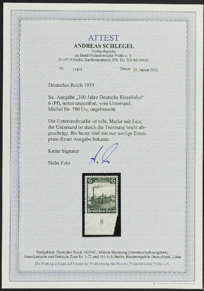 | Zusatzinformationen und Suchstichworte: | 32. Schlegel Auktionshaus Auktion 15. - 19. Mai 2023 Los 5790 Deutsches Reich, 1933/45 Drittes Reich 1935, 6 Pfg. 100 Jahre Deutsche Eisenbahn, unten UNGEZÄHNTE ungebrauchte Marke vom Unterrand, insgesamt sind nur wenige Stücke hiervon bekannt Zuschlag 620,00 EUR |