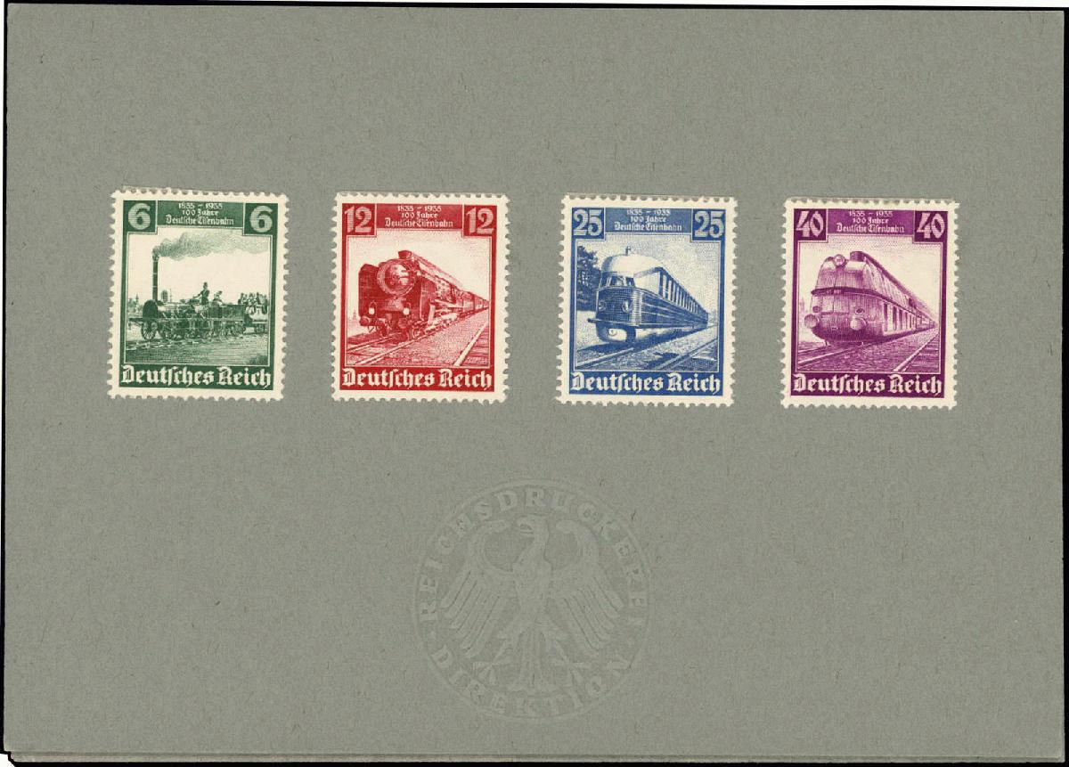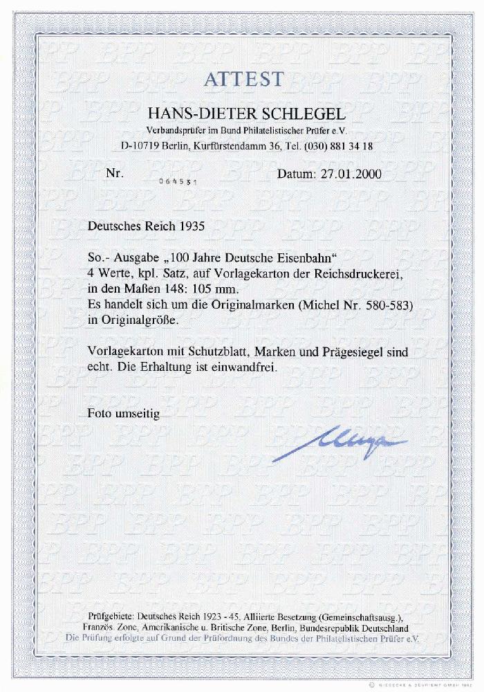 | Zusatzinformationen und Suchstichworte: | 32. Schlegel Auktionshaus Auktion 15. - 19. Mai 2023 Los 5791 Deutsches Reich, 1933/45 Drittes Reich 2935, 6-40 Pfg. 100 Jahre Deutsche Eisenbahn, kompletter Satz auf Vorlagekarton der Reichsdruckerei in den Maßen 148:105 mm, einwandfrei, mit Pergaminschutzblatt, dieses etwas Knitterspuren durch Umklappen Zuschlag 520,00 EUR |