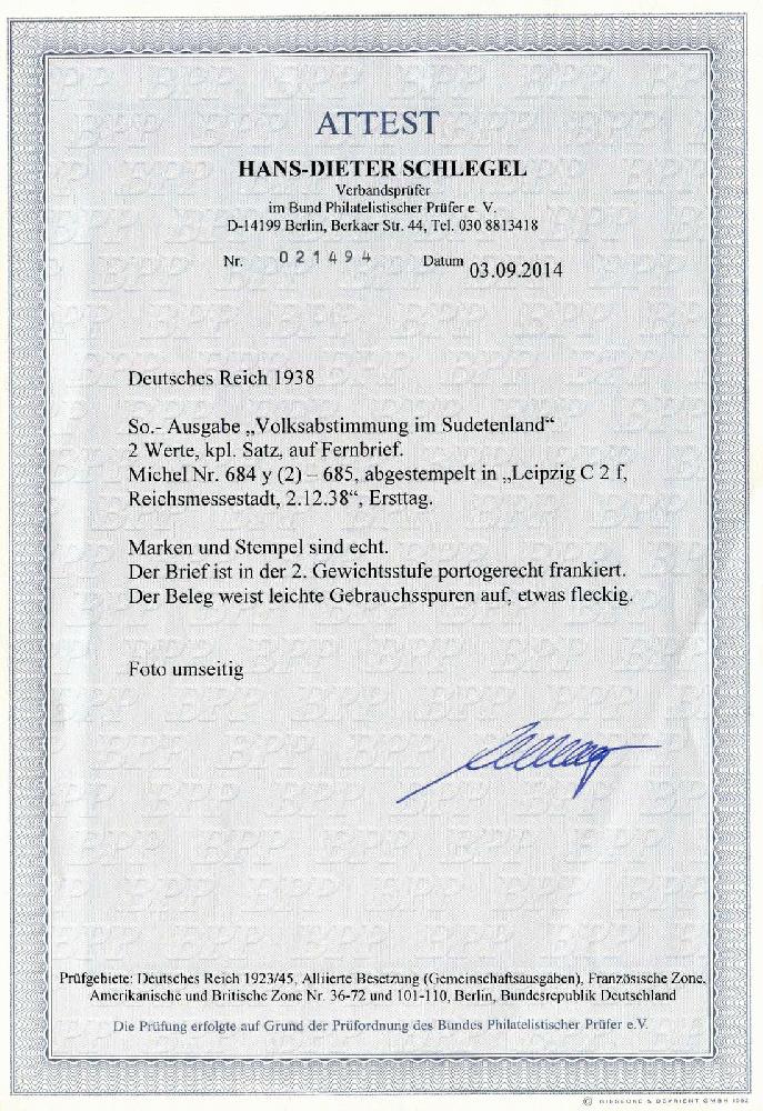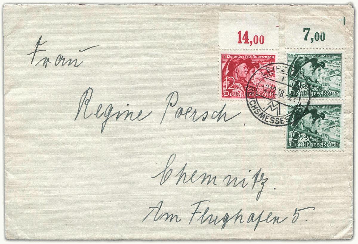 | Zusatzinformationen und Suchstichworte: | 32. Schlegel Auktionshaus Auktion 15. - 19. Mai 2023 Los 5822 Deutsches Reich, 1933/45 Drittes Reich 1938, 6+4 und 12+8 Pfg. Sudetenland-Abstimmung, beide Werte vom Oberrand (die 6+4 Pfg. im senkrechten Paar) auf portogerechtem Fernbrief (2. Gewichtsstufe) mit Ersttagsentwertung "LEIPZIG C 2 f REICHSMESSESTADT 2.12.38", leichte Gebrauchsspuren Zuschlag 200,00 EUR |