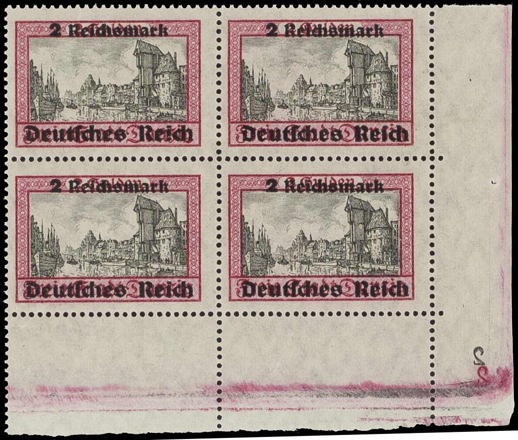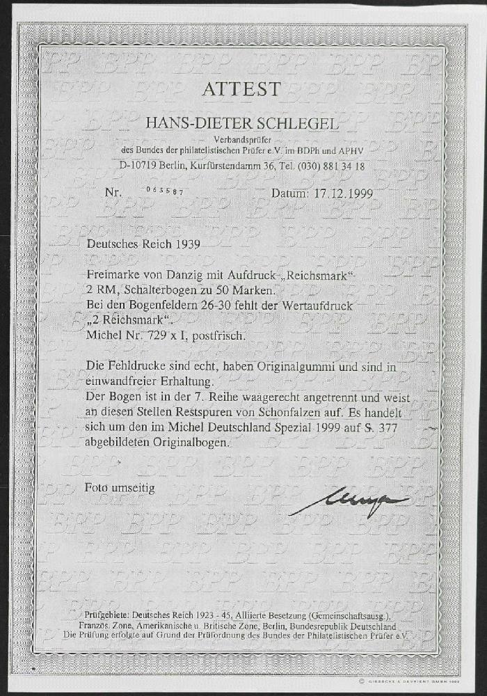 | Zusatzinformationen und Suchstichworte: | 32. Schlegel Auktionshaus Auktion 15. - 19. Mai 2023 Los 5832 Deutsches Reich, 1933/45 Drittes Reich 1939, 2 RM auf 2 G. Danzig-Überdruck postfrisch im Viererblock aus der rechten unteren Bogenecke mit spiegelverkehrter Plattennummer "2" über "2", die Einheit stammt aus dem Literatur bekannten Bogen ohne Wertaufdruck, Kopie des Fotoattestes Schlegel für den kompletten Bogen anbei, Seltenheit in einwandfreier Qualität, ungefaltet und unsigniert (ME Handbuch 440,-) Ausruf 180,00 EUR |