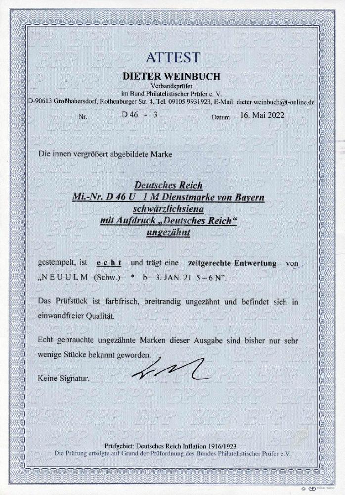 | Zusatzinformationen und Suchstichworte: | 32. Schlegel Auktionshaus Auktion 15. - 19. Mai 2023 Los 5870 Deutsches Reich 1920, 1 M. Dienstmarke, ungezähnt, breitrandig, gestempelt, einwandfrei, echt gebrauchte ungezähnte Exemplare sind bisher nur sehr wenige bekannt! Ausruf 1.000,00 EUR |