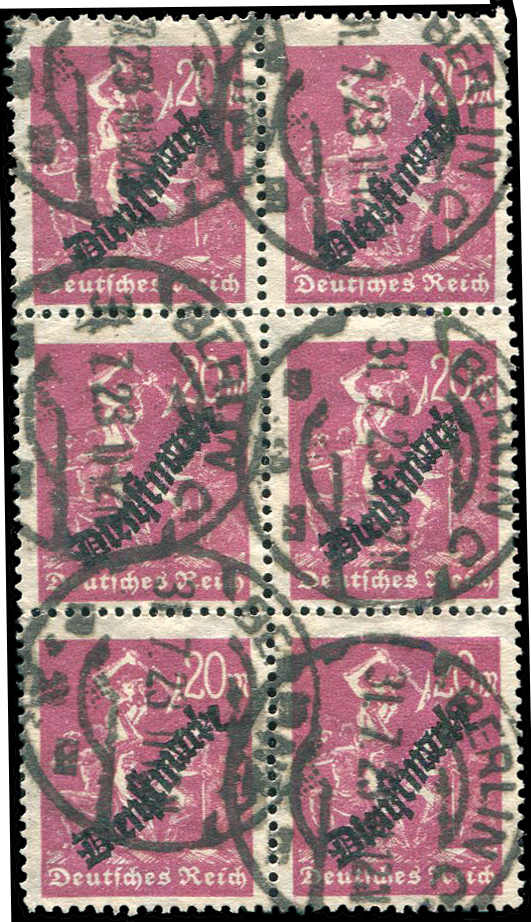 | Zusatzinformationen und Suchstichworte: | 32. Schlegel Auktionshaus Auktion 15. - 19. Mai 2023 Los 5878 Deutsches Reich 1923, 20 M. Dienstmarke im gestempelten Sechserblock mit liegendem Wasserzeichen, dabei die linke obere Marke mit einem Zahnfehler und die linke untere Marke mit einem Eckzahnbug, die Einheit ist vorgefaltet, dennoch selten Ausruf 170,00 EUR |