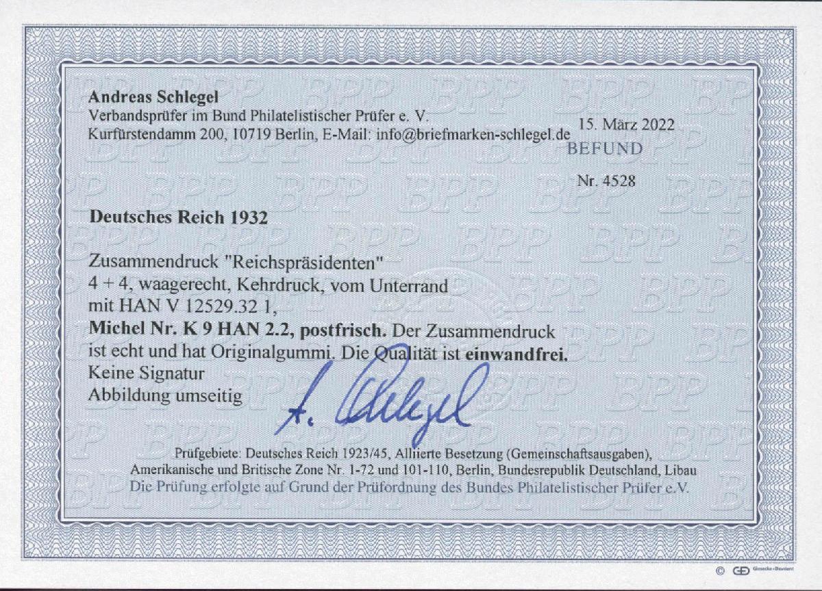 | Prüfgebiet: | Deutsches Reich Markenheftchen u. Zusammendrucke 1900 - 1945 |