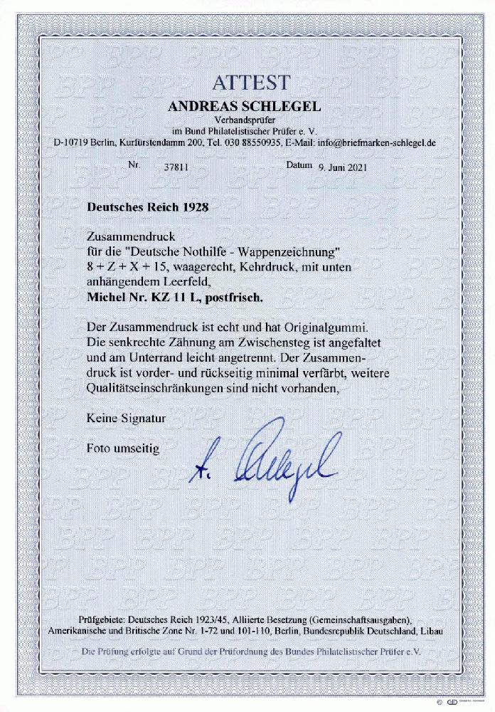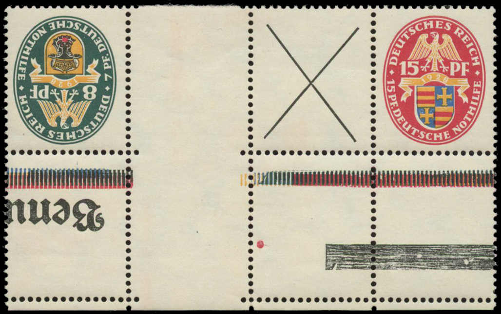 | Zusatzinformationen und Suchstichworte: | 32. Schlegel Auktionshaus Auktion 15. - 19. Mai 2023 Los 5918 Deutsches Reich, 1923/32 Weimarer Republik 1928, 8 Pfg. Nothilfe mit oben anhängendem Leerfeld im Kehrdruck mit 15 Pfg. Nothilfe mit links anhängendem Andreaskreuz und oben anhängenden Leerfeldern sowie mit Zwischenstegen vom Unterrand, postfrisch, senkrechte Zähnung am Zwischensteg angefaltet und am Unterrand leicht angetrennt, vorder- und rückseitig minimal verfärbt, sonst einwandfrei Zuschlag 2.000,00 EUR |