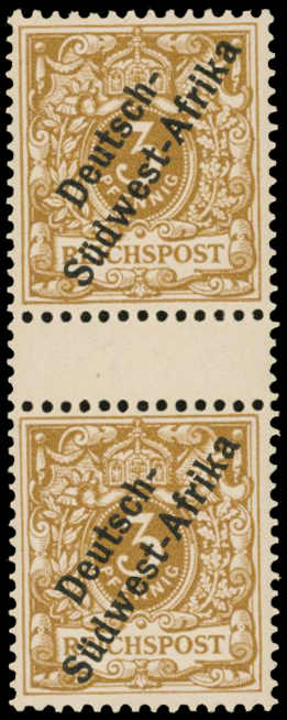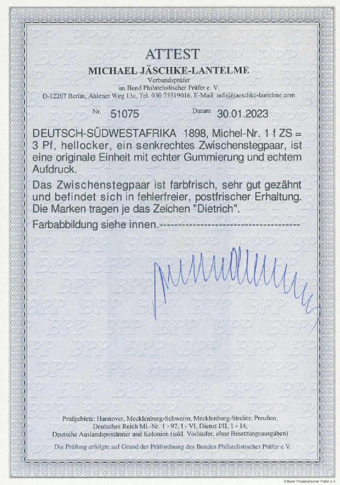 | Zusatzinformationen und Suchstichworte: | 32. Schlegel Auktionshaus Auktion 15. - 19. Mai 2023 Los 34 Deutsche Kolonien Südwestafrika 1898, 3 Pfg. Krone/Adler mit Aufdruck im senkrechten Paar mit Zwischensteg in bester Farbvariante Hellocker, postfrisch in Luxusqualität, signiert Dietrich sowie Fotoattest Jäschke-Lantelme BPP 01/2023 (die Einzelmarken notieren im Michel für postfrisch bereits 1.000,- Euro, für das Zwischenstegpaar ist keine Bewertung notiert) Ausruf 700,00 EUR |