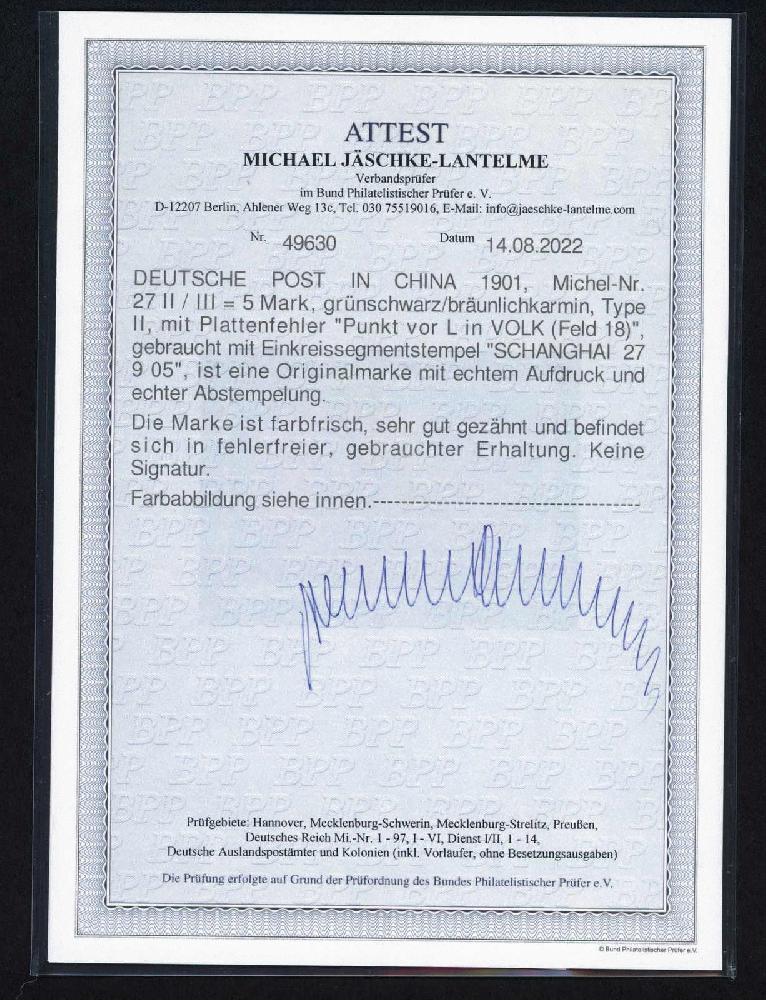 | Prüfer: | Jäschke-Lantelme, Michael (BPP (Bund Philatelistischer Prüfer)) |