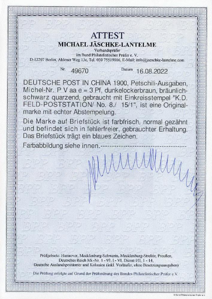 | Prüfgebiet: | Deutsche Auslandspostämter China Petschili-Ausgaben |