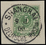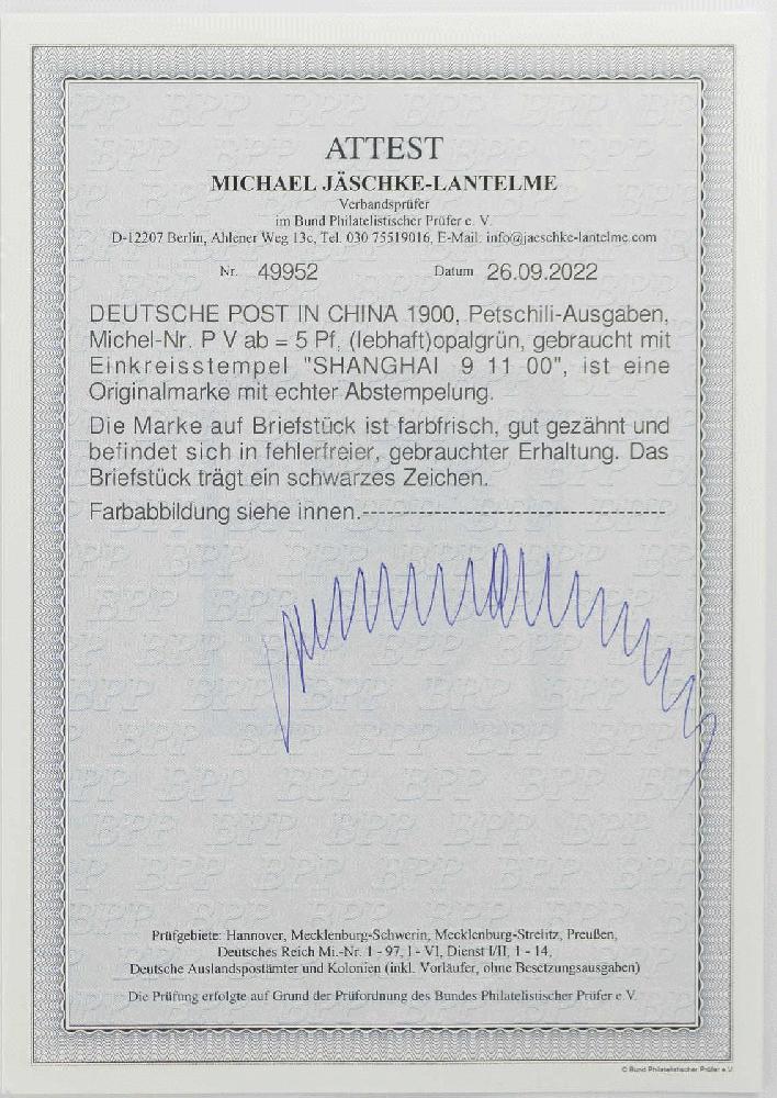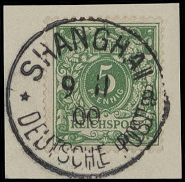 | Zusatzinformationen und Suchstichworte: | 32. Schlegel Auktionshaus Auktion 15. - 19. Mai 2023 Los 6019 Deutsche Auslandspost China, Petschili Ausgaben 1900, 5 Pfg. Krone/Adler opalgrün ohne Aufdruck während der Boxer-Unruhen im Petschili-Gebiet verwendet, auf Briefstück mit Stempel "SHANGHAI DEUTSCHE POST 9/11 00" Ausruf 800,00 EUR |