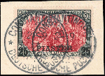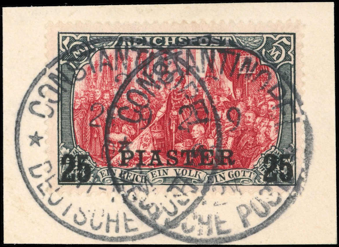 | Zusatzinformationen und Suchstichworte: | 32. Schlegel Auktionshaus Auktion 15. - 19. Mai 2023 Los 6061 Deutsche Auslandspost Türkei 1903, 25 PIA. auf 5 M., Aufdrucktype II "A oben mit Serife", Briefstück mit Stempel "CONSTANTINOPEL 29 9 05", farbfrisch und gut gezähnt, einwandfrei Ausruf 220,00 EUR |