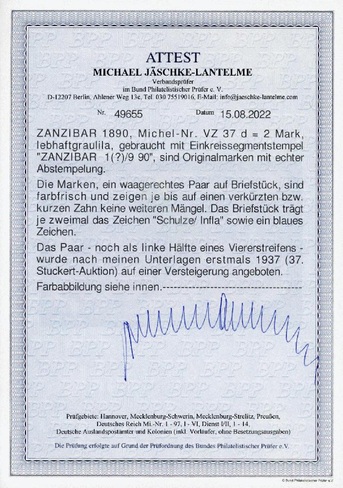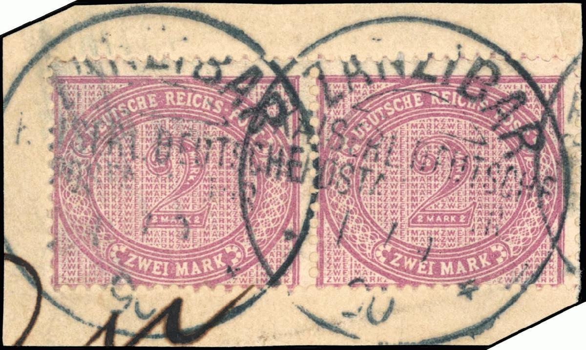 | Zusatzinformationen und Suchstichworte: | 32. Schlegel Auktionshaus Auktion 15. - 19. Mai 2023 Los 6078 Deutsche Kolonien Ostafrika, Vorläufer Sansibar 1890, 2 M. Innendienst lebhaftgraulila, waager. Paar auf kl. Briefst., entwertet mit zwei Abschlägen "ZANZIBAR KAISERL. DEUTSCHE POSTAGENTUR 1?/9 90", farbfrisch und je eine verkürzte Zahnspitze, selten angeboten Zuschlag 990,00 EUR |
