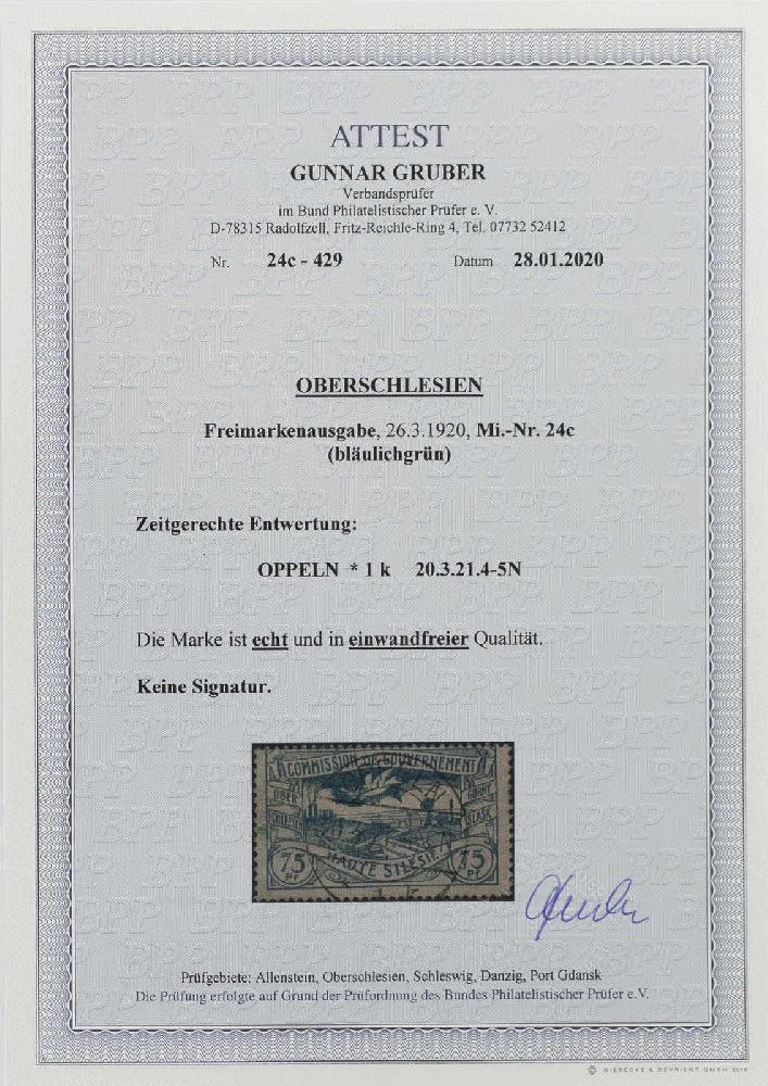 | Zusatzinformationen und Suchstichworte: | 32. Schlegel Auktionshaus Auktion 15. - 19. Mai 2023 Los 6375 Oberschlesien 1920, 75 Pfg. bläulichgrün, entwertet "OPPELN *1 k 20.3.21" Ausruf 600,00 EUR |