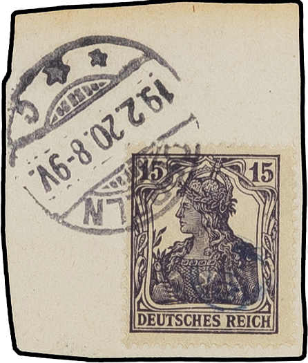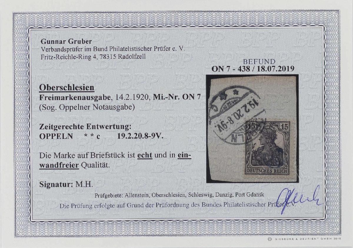 | Zusatzinformationen und Suchstichworte: | 32. Schlegel Auktionshaus Auktion 15. - 19. Mai 2023 Los 6382 Ost-Oberschlesien Oppelner Notausgabe 1920, 15 Pfg. Germania schwarzviolett mit blauem Handstempelaufdruck "C.I.H.S." auf Briefst., entwertet "OPPELN ** c 19.2.20.8-9V" Zuschlag 120,00 EUR |