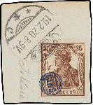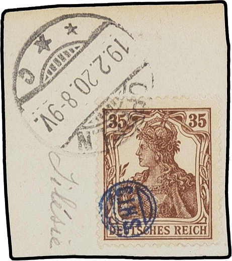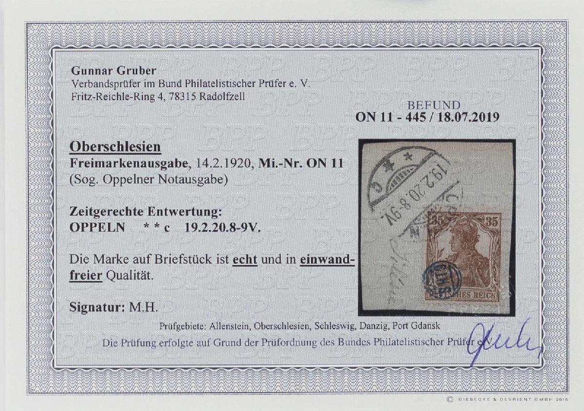 | Zusatzinformationen und Suchstichworte: | 32. Schlegel Auktionshaus Auktion 15. - 19. Mai 2023 Los 6383 Ost-Oberschlesien Oppelner Notausgabe 1920, 35 Pfg. Germania dunkelbraunorange mit blauem Handstempelaufdruck "C.I.H.S." auf Briefst., entwertet "OPPELN ** c 19.2.20.8-9V" Zuschlag 180,00 EUR |