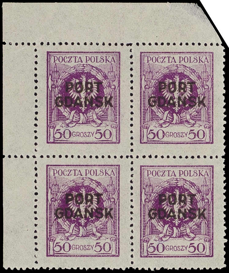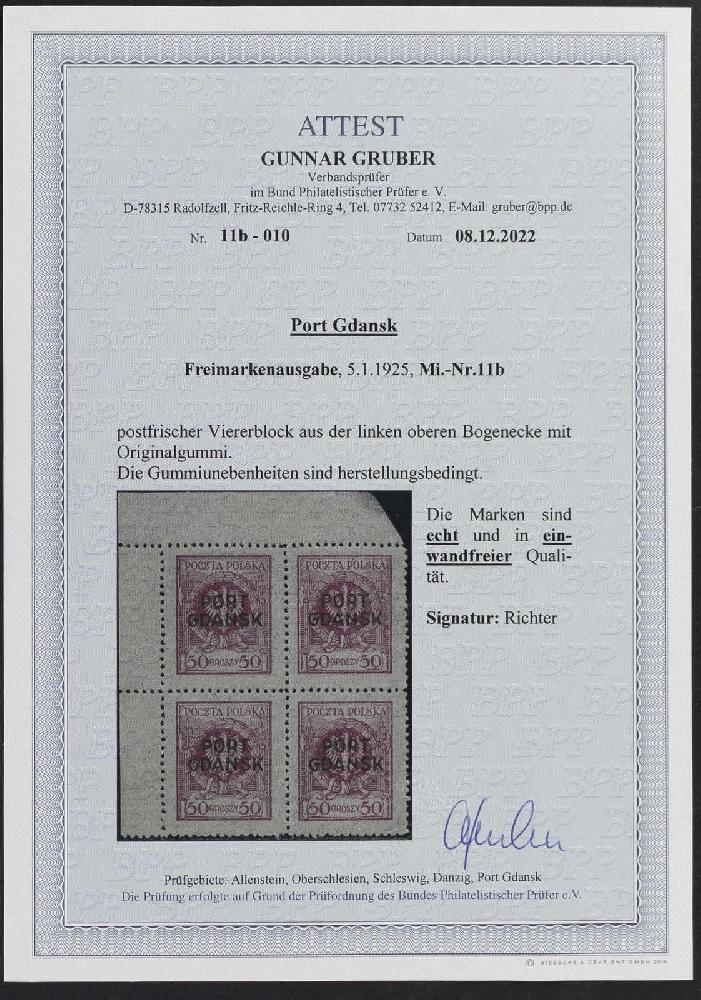 | Zusatzinformationen und Suchstichworte: | 32. Schlegel Auktionshaus Auktion 15. - 19. Mai 2023 Los 4777 Polen Ausgaben für Port Gdansk 1925, 50 Gr. dunkellilapurpur mit Aufdruck "PORT GDANSK" in Aufdrucktype b im postfrischen Viererblock aus der linken oberen Bogenecke, Oberrand rechts abgeschrägt und gering hell, sonst einwandfrei Ausruf 200,00 EUR |