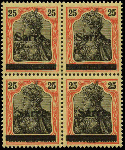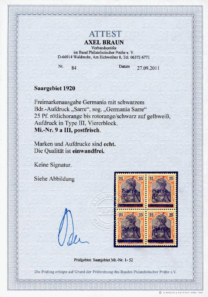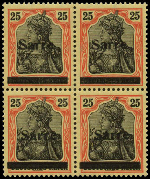 | Zusatzinformationen und Suchstichworte: | 32. Schlegel Auktionshaus Auktion 15. - 19. Mai 2023 Los 6465 Saar 1920, 25 Pfg. Germania-Sarre rötlichorange bis rotorange/schwarz auf gelbweiß, Type III, postfrischer Viererblock in einwandfreier Qualität, ungefaltet und unsigniert Ausruf 300,00 EUR |