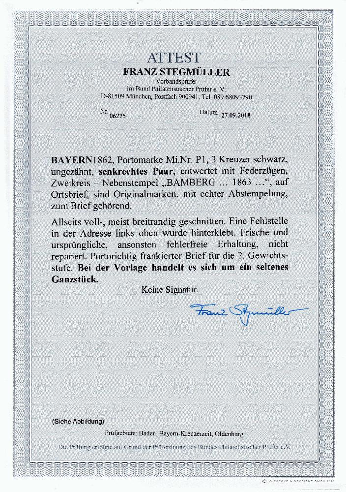 | Prüfgebiet: | Altdeutschland Bayern Portomarken |